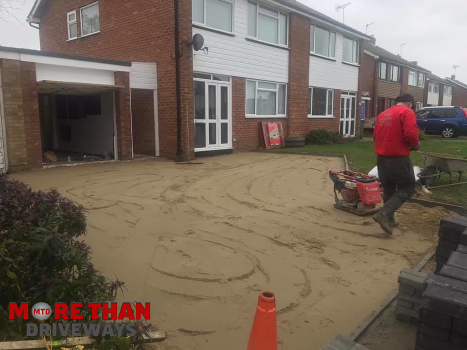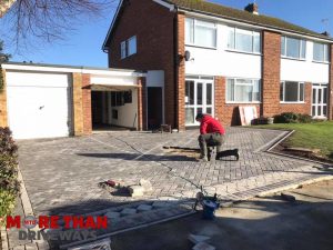New driveway installation by More Than Driveways. Replaced the old driveway area completely leaving in a small shaped lawn area to create one large driveway. Put in flat top edging kerbs around the entire driveway to retain it.